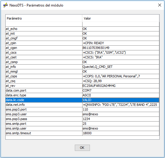 La licencia habilita, en la aplicación, el uso de las funciones que requieren servicio de datos (no se requiere para las funciones de diagnóstico). Para verificar, que la licencia se haya ingresado correctamente, puede utilizarse la opción Módulo, donde debe comprobarse el valor del parámetro data.lic.code, como se muestra en la siguiente imagen: