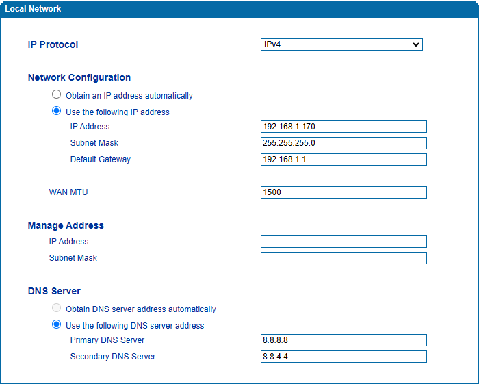 Conexionado En la siguiente imagen se presenta el diagrama de conexionado, para los puertos de red, para los puertos FXS y para la alimentación, en un equipo de 8 puertos analógicos: ![]() En la siguiente imagen se presenta el diagrama de conexionado, para los puertos de red, para los puertos FXS y para la alimentación, en un equipo de 16 puertos analógicos: ![]() En la siguiente imagen se presenta el diagrama de conexionado, para los puertos de red (se utiliza GE0 como puerto de red LAN), para los puertos FXS en cada Slot y para la alimentación, en un equipo de 128 puertos analógicos: ![]() Al conectar cualquiera de estos FXS Gateways, previo al proceso de configuración, para obtener la dirección IP del puerto de red (LAN0 o GE0 para el equipo de 128 puertos) desde cualquier puerto analógico FXS, puede conectarse un teléfono convencional (analógico) y marcar el comando: *158# . Conexionado en una red LAN El diagrama esquemático de conexionado, de un FXS Gateway, a una red LAN, donde se encuentra el equipo IP PBX, es el siguiente: ![]() El FXS Gateway permite incorporar, al sistema VoIP, las prestaciones de un número mayor de dispositivos analógicos, adicionales a los que permiten los puertos analógicos, de un equipo IP PBX híbrido. Entre los dispositivos que permite integrar, se encuentran los teléfonos analógicos convencionales, los equipos de FAX y las terminales POS, o la interconexión con una central PBX analógica existente. Configuración Ingreso a la interfase web El gateway, según el modelo, dispone de una o dos interfases de red: LAN y WAN. De acuerdo al entorno de red, donde se instalará el equipo, se determina que interfase se utilizará. Para lograr el acceso a su interfase web (Web Management System), se conecta el equipo a la red local, a través de su puerto LAN. Desde una PC, conectada a la misma red local, se utiliza un navegador, para acceder a la configuración del gateway. La PC debe poder acceder a la dirección IP de fábrica (192.168.11.1) del equipo. Cuando las direcciones de LAN, se encuentran en la misma subred que la del equipo, es decir, tienen el formato 192.168.11.xxx, el acceso desde el navegador es directo. En caso contrario, cuando la PC se encuentra en otra subred, por ejemplo, 192.168.11.xxx, debe agregarse otra dirección IP, a la placa de red de la PC, para lograr el acceso al equipo IP PBX. Para información más detallada, consultar Configuración de subred. Desde el navegador, para ingresar a la interfase web (al menos, la primera vez), debe utilizarse la dirección IP de fábrica (192.168.11.1) del equipo. Luego, de acuerdo a los requerimientos de la instalación y de seguridad, puede modificarse esta dirección, desde la configuración de red. En el navegador, al acceder a la interfase web del gateway, se observa la siguiente imagen: ![]() Ingresando las credenciales: admin / admin, aparece la pantalla principal de la interfase web: ![]() En el caso del equipo de 128 puertos analógicos, la información del sistema se presenta de la siguiente forma: ![]() En este caso, junto con la información de estado del sistema se presenta la información de estado de los puertos. La siguiente imagen muestra un gateway completamente equipado con puertos FXS. ![]() Parámetros de red Si se desea incorporar el gateway, a una red local existente, sólo se utiliza la interfase LAN (el cable de red se conecta al puerto LAN 0). Entonces, basado en los parámetros de la red, deben configurarse los parámetros de esta interfase. Debe tenerse en cuenta que, en este caso, el Modo de red (Network Mode) debe estar en Bridge (Puente) debido a que solo se utiliza el puerto de LAN. Por ejemplo, si utilizamos una dirección estática para el gateway, tal como: 192.168.1.164, porque deseamos integrarla a una red del tipo: 192.168.1.xxx/255.255.255.0, en la configuración de LAN del equipo, deberían cargarse los siguientes valores (Network > Local Network): ![]() En esta interfase definimos, bajo la opción Use the following IP address, la dirección IP del gateway (IP Address): 192.168.1.164, la máscara de subred (Subnet Mask): 255.255.255.0 correspondiente, y la puerta de enlace por defecto (Default Gateway): 192.168.1.200 (debe utilizarse la dirección IP correspondiente a su red, por lo general, la dirección IP del router), junto con las direcciones de los servidores DNS primario (Primary DNS Server): 8.8.8.8 , y DNS secundario (Secondary DNS Server): 8.8.4.4. En el caso del equipo de 128 puertos analógicos, la configuración de red presenta los siguientes parámetros: por ejemplo, si utilizamos una dirección estática para el gateway, tal como: 192.168.1.170, porque deseamos integrarla a una red del tipo: 192.168.1.xxx/255.255.255.0, en la configuración Network >> Local Network del equipo, deberían cargarse los siguientes valores (Network > Local Network): ![]() En esta interfase definimos, bajo la opción Use the following IP address, la dirección IP del gateway (IP Address): 192.168.1.170, la máscara de subred (Subnet Mask): 255.255.255.0 correspondiente, y la puerta de enlace por defecto (Default Gateway): 192.168.1.1 (debe utilizarse la dirección IP correspondiente a su red, por lo general, la dirección IP del router), junto con las direcciones de los servidores DNS primario (Primary DNS Server): 8.8.8.8 , y DNS secundario (Secondary DNS Server): 8.8.4.4. Servidor SIP Para establecer los parámetros del servidor SIP, en el cual se registrará el FXS gateway, debe ingresarse a la opción de menú: SIP Server. La configuración básica requiere la dirección IP (SIP Server) y el puerto (SIP Server Port) del servidor. En caso de no utilizarse el protocolo de transporte UDP, por defecto, para SIP, debe seleccionarse otra opción en el campo: SIP Transport Type y el puerto correspondiente, en la sección Local SIP Port. Las opciones disponibles son: UDP, TCP, TLS y Automatic. ![]() En el caso del equipo de 128 puertos analógicos, la confi
