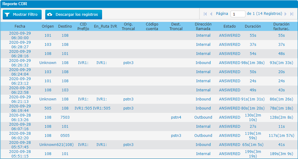 - Administración de los mensajes grabados en el Correo de voz (Voicemail). - Configuración de los servicios del Correo de voz (Voicemail settings): habilitar/deshabilitar el servicio de correo de voz, definir un acceso con password, y habilitar/deshabilitar el servicio de envío del archivo de mensaje, como adjunto, a una dirección de correo electrónico. - Administración de las grabaciones de llamadas (Monitoring, Auto Recordings), correspondientes a la propia extensión o a un grupo de extensiones (en este caso actúa como supervisor del grupo configurado). Ingreso a la interfase de usuario El ingreso para administración de extensiones auto-gestionadas por el usuario, se logra ingresando a la interfase web, del equipo Nexo IP PBX, utilizando por defecto: - la dirección IP de fábrica (192.168.6.200), o - la dirección IP de LAN configurada, por el administrador del sistema, para este equipo. Esta información de acceso, para el usuario, debe ser suministrada por el administrador del sistema VoIP. Cuando aparece, en el navegador, la pantalla de ingreso (Login): ![]() para acceder a la administración de extensiones, deben ingresarse sus credenciales de acceso web (son las credenciales del usuario habilitado para esa extensión y no las de administrador). A modo de ejemplo, si el nro_extensión es 101, el número de la extensión que se desea administrar, entonces, ingresando en los campos Nombre de usuario / Contraseña, las credenciales como están definidas por el administrador (en Ingreso Web para la extensión 101), se accede a las funciones de administración para esa extensión. La siguiente imagen muestra la interfase web que presenta la administración de extensiones auto-gestionadas por el usuario, (cuando se selecciona la opción Reporte CDR de la extensión). ![]() IMPORTANTE: El administrador del sistema VoIP controla el acceso, y los permisos que se conceden, a cada usuario, para ingresar a las funciones de administración, de cada extensión. Las credenciales por defecto, para una extensión, son: nro_extensión / nro_extensión. Por razones de seguridad, estas credenciales deben cambiarse al momento de crear la extensión, por lo cual se debe consultar al administrador para obtener las credenciales de acceso actualizadas. Correo de voz (Voicemail) La opción Lista Correo de voz (Voicemail List) permite al usuario de la extensión, visualizar sus mensajes de correo de voz, junto con la siguiente información: Fecha (Date), Tiempo (Time), Carpeta (Folder), Identificador del origen de la llamada (Caller ID) y Duración (Duration). Además, desde los íconos, en la columna de Opciones (Options), permite ejecutar alguna de las siguientes acciones, sobre el archivo de correo de voz seleccionado: Reproducir (Play), Descargar (Download), Borrar (Delete) o Mover (Move) de una carpeta a otra: Nueva (New), Vieja (Old), Familia (Family), Trabajo (Work), Amigos (Friends). ![]() La opción Configuración Correo de voz (Voicemail Setting) permite habilitar la cuenta de correo de voz, para el usuario de la extensión y establecer los parámetros que definen su comportamiento. ![]() Habilitar Correo de voz (Enable Voicemail), permite activar la cuenta para el correo de voz. Deshabilitar PIN Autenticación Correo de voz (Disable Voicemail PIN Authentication), permite el acceso directo al correo de voz, sin solicitar password. Número PIN de acceso para la cuenta de correo de voz (PIN Number), es la contraseña que se utiliza para acceder al correo de voz, de la extensión. Dirección de Email (Email Address), es la dirección de correo electrónico, que permite definir si el mensaje se envía, como archivo adjunto, a la dirección especificada. Email Adjunto (Email Attachment), define si se adjunta el archivo de sonido, con el mensaje en el correo de voz, al e-mail especificado. Reproducir CID (Play CID), lee el número telefónico del origen previamente a la reproducción del mensaje entrante. Reproducir Sobre o Ensobrado del mensaje (Play Envelope), define si el sistema de correo de voz debe reproducir el ensobrado del mensaje (fecha y hora), antes de la reproducción de su contenido. Borrar Correo de voz (Delete Voicemail), activa el borrado del mensaje de la bandeja de correo de voz, después de haber sido enviado por correo electrónico. Para que los mensaje no se pierdan, debido al borrado, debe asegurarse de marcar la opción Email Adjunto a la dirección de e-mail (Email Attachment), y haber completado correctamente el campo Dirección de Email (Email Address) con el destino del correo electrónico. La interfase web, advierte al usuario sobre esta condición, mostrando el siguiente mensaje, en la información de este campo: ![]() El correo electrónico recibido en la bandeja de entrada, del destino configurado en el campo: Dirección de Email (Email Address), contiene la siguiente información (donde también se observa el archivo con el mensaje de voz adjunto): ![]() El texto correspondiente al contenido del email, está definido por el administrador, en Administración de Voz > Configuración de Correo de voz > Configuración Email > Email Cuerpo (Voice Management > Voicemail Settings > Email Settings > Email Body), junto con el remitente y el asunto, en los campos: De y Email Asunto, respectivamente. Registros de llamadas Registros detallados de llamadas de la extensión La opción Reporte CDR de extensión (Extension CDR Report), presenta información detallada sobre las llamadas correspondientes a la propia extensión (en la imagen se muestran las llamadas correspondientes a la extensión 108). ![]() El usuario de la extensión puede realizar una búsqueda y aplicar un filtro, con la opción Mostrar Filtro (Show Filter), sobre los datos mostrados, en la lista de llamadas. Los parámetros de este filtro incluyen: Fecha inicio (Start Date), Fecha final (End Date), Duración mínima (Minimum Duration), Duración máxima (Maximum Duration), Origen (Source), Destino (Destinat