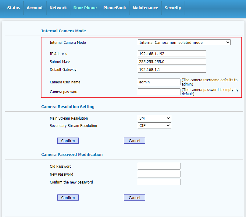 Donde: Por EXT: significa que la llamada se realiza utilizando el número de extensión del dispositivo destino (en forma alternativa, puede ser por Agenda), Por B/U/R: significa que la llamada se efectúa utilizando los números de edificio (Building), unidad (Unit) y residencia (Room), Por Ag/IP: significa que la llamada se realiza utilizando la Agenda, con la dirección IP del dispositivo destino. Cómo configurar la VideoConsola para ver la cámara de un VideoPortero desde la opción Cámara/Monitor? Ingresar a la interfase web de la VideoConsola utilizando las credenciales de acceso: user / 1234 , como se observa en la siguiente imagen: ![]() Seleccionar la opción General >> IPC para ingresar a la configuración de las camaras IP. ![]() Utilizando el botón + Add puede agregarse una cámara ingresando sus parámetros: Nombre (Name) y su URL (IPC URL), como se observa a continuación: ![]() En este caso, se utiliza el nombre IPC1 para la cámara del VideoPortero, cuya URL es: rtsp://admin:@192.168.1.192:554/channel=1&stream=1.sdp?real_stream La configuración de la cámara interna (Internal Camera Mode), en el VideoPortero, que corresponde a los valores anteriores, es: (debe tenerse en cuenta que la dirección IP del VideoPortero, en este ejemplo: 192.168.1.199, es diferente de la dirección IP de su cámara: 192.168.1.192) ![]() En la configuración de la VideoConsola, la sintaxis general para la URL es: rtsp://[username]:[password]@[camera_ip]:[ip_port]/channel=1&stream=1.sdp?real_stream donde deben utilizarse los valores configurados en la cámara interna del VideoPortero. La configuración de la función Monitor / Cámara (IPC), puede hacerse también desde la pantalla de la propia VideoConsola, usando la opción de configuración (en el extremo superior derecho cuando se ingresa a la opción de monitoreo), para agregar nuevas cámaras IP con sus respectivos parámetros (Nombre y URL de CIP: IPC URL), utilizando el teclado virtual de la aplicación. ![]() Para información más detallada, sobre configuración, consultar VideoConsola IP - Guía de configuración básica. Cómo configurar la apertura de cerradura desde la VideoConsola con la opción Panel/Doors? La VideoConsola, desde la opción Panel/Doors, puede enviar un comando HTTP para la apertura de cerradura en un VideoPortero. ![]() Para ver la sintaxis del comando que debe ingresarse en el campo HTTP URL y la configuración en VideoPortero, consultar R218. Cómo configurar el botón de Vigilancia/Portería en un VideoPortero IP multi-botón? Para configurar el botón (one touch call button), que se encuentra en el frente del VideoPortero IP, destinado a Vigilancia/Portería (y, opcionalmente la opción por defecto para el Botón de llamada), que se observa en la imagen que está a continuación: ![]() Debe ingresarse a la interfase web del VideoPortero, desde el menú Door Phone >> Call Feature para configurar la opción: Security Staff Button (Botón personal de seguridad), como se observa en la siguiente imagen: ![]() Adicionalmente, puede configurarse la opción Call Button, para que cuando se pulse en el frente el Botón de llamada, sin haber marcado previamente un número, llame a una extensión específica para su atención. En la configuración mostrada, al pulsar en el frente, el botón perteneciente a Vigilancia/Portería o el Botón de llamada (sin número) el equipo llama a la misma extensión, en este caso, corresponde al número 105. Cómo puede comprobarse el accionamiento de cerradura en un VideoPortero desde su interfase web? El accionamiento de cerradura, en un VideoPortero, puede comprobarse desde su interfase web, utilizando la opción Door Lock en el menú Door Phone, como puede observarse en la siguiente imagen: ![]() Desde la sección Door Lock Control, puede seleccionarse el Switch1 (1), el Switch2 (2) o ambos (All) desde la opción Door Lock. Desde la opción Action puede elegirse la acción a ejecutar: Abrir (Open) o Cerrar (Close). Luego, con el botón Execute se envía el comando para accionamiento de cerradura, de acuerdo a los parámetros seleccionados (Door Lock y Action), al VideoPortero. En la sección Door Lock Status puede observarse el cambio de estado en los campos Door Lock Status 1 y Door Lock Status 2, mediante la transición Off -> On -> Off, para cada uno de los switches. Qué ajustes pueden hacerse en la configuración de los switches para accionamiento de cerradura en un VideoPortero? Los ajustes en el modo de operación de los switches (Switch Mode) para accionamiento de cerradura, pueden hacerse desde el menú Door Phone en la opción Basic, como se observa a continuación: ![]() La configuración más común es utilizar un modo temporizado (Monostable) y se ajusta la duración del accionamiento de cerradura (en el campo Switch-On Duration). El segundo switch puede operar en forma independiente (Second Door Open Method: Independent) o en forma conjunta temporizada con respecto al primer switch (Second Door Open Method: Asynchronous Delay) ajustando el tiempo de retardo en la respuesta (en el campo Asynchronous Delay Time). Dónde se configuran los códigos DTMF para apertura de cerradura en un AudioPortero o VideoPortero? Los códigos DTMF, de un dígito, para apertura de cerradura, pueden configurarse, en términos generales, desde el menú Door Phone, en la opción Access, desde la sección Open Door By DTMF Code en los campos Door 1 y Door 2 respectivamente (cuando el dispositivo está equipado con 2 switches), como se observa en la siguiente imagen: ![]() Dependiendo del modelo del equipo y el número de botones, puede variar el menú donde se encuentra esta opción. En el caso del modelo DP91-S (equipado con un botón), la opción para apertura de cerradura se encuentra en el menú: Equipment >> Access >> Open Door By DTMF Code en el campo Door 1. ![]() Cómo se configura un VideoPortero cuando la cerradura utiliza una fuente de alimentación externa? Por defecto, la conf